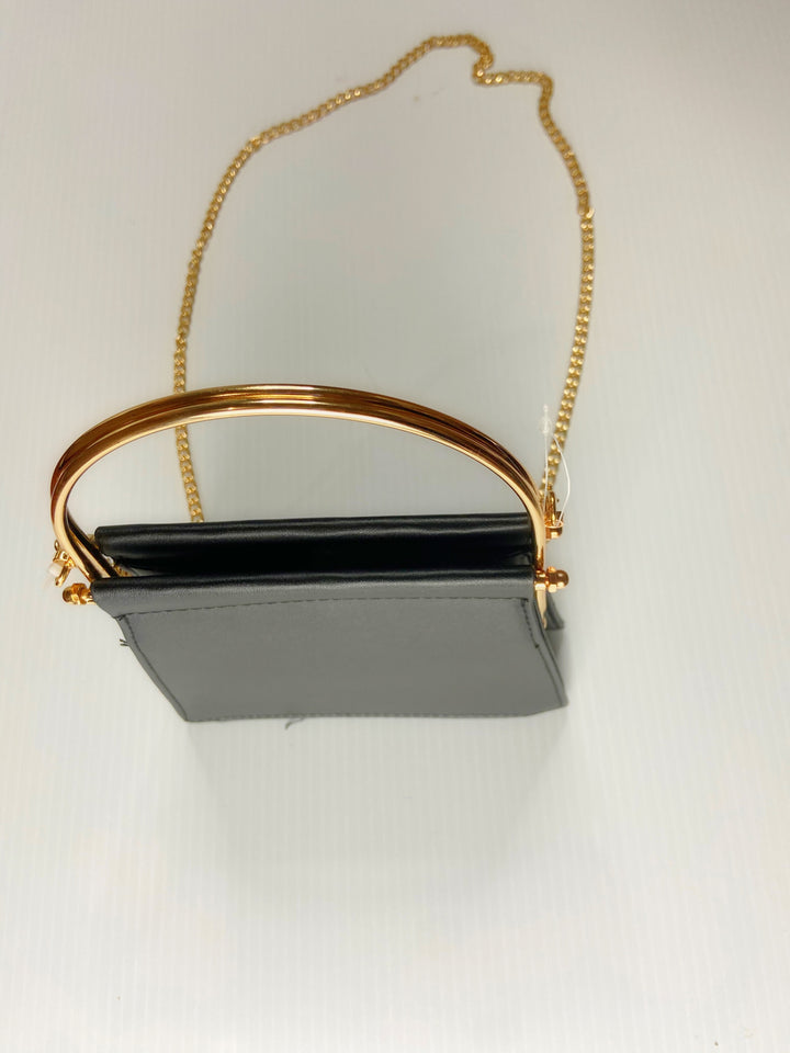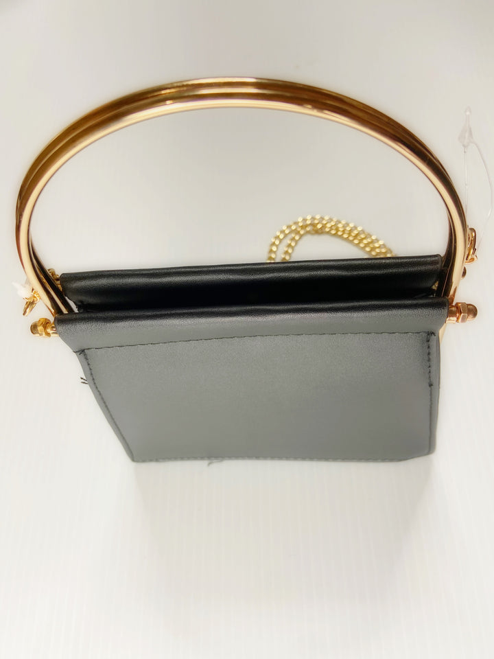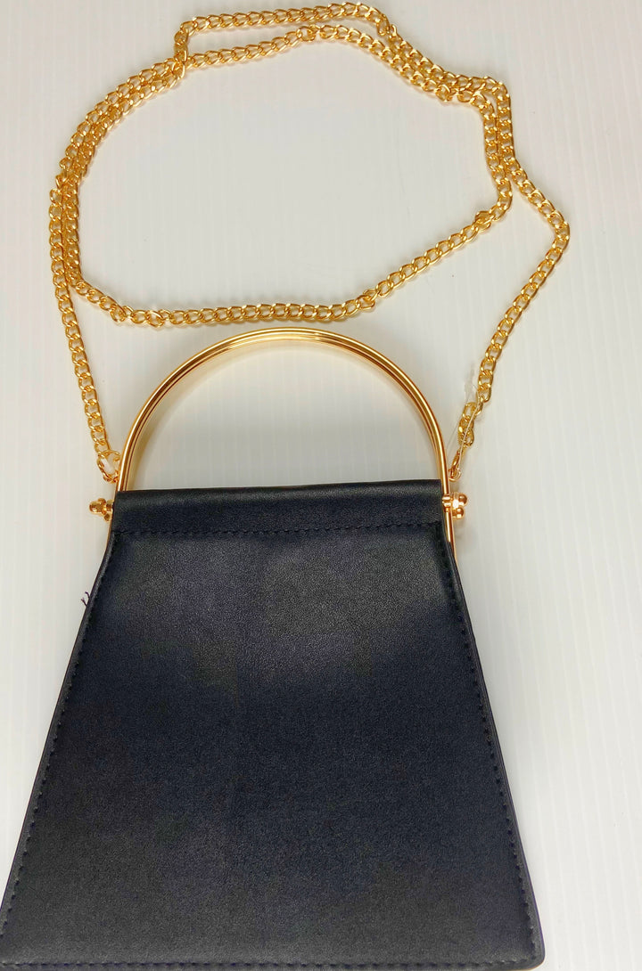 This cute purse is perfect for any look. Features gold metal hardware and detachable gold chain strap.